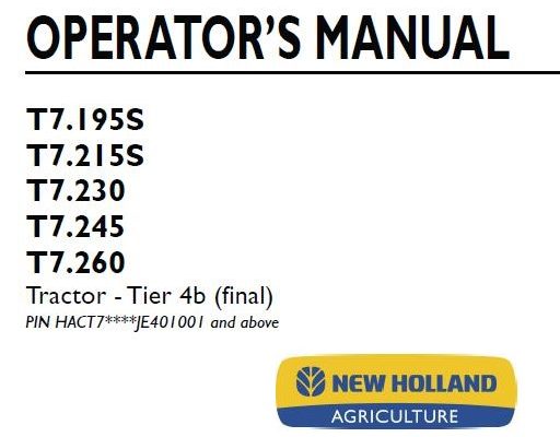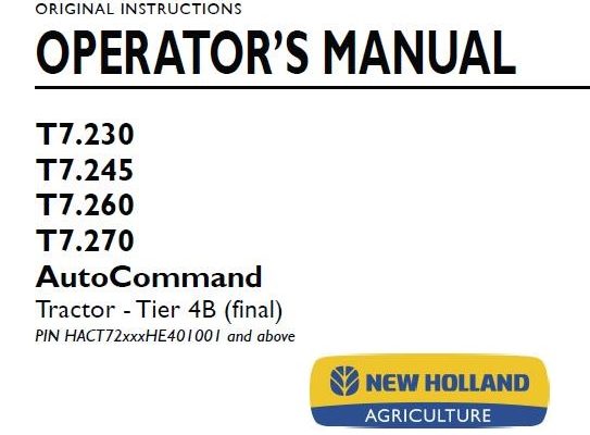 New Holland T6.145, T6.155, T6.165, T6.175, T6. 180 AutoCommand Tier 4B (final) Tractor Operator’s Manual