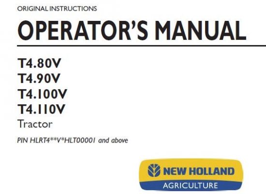 New Holland T4.80V,T4.90V, T4.100V, T4.110V Tractor Operator’s Manual ( PIN HLRT4**V*HLT00001 and above )
