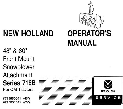 Read This New Holland 48″ & 60″ Front Mount Snowblower Attachment Series 716B For CM Tractors Operator’s Manual carefully to learn how to operate and service your machine correctly. Failure to do so could result in personal injury or equipment damage.