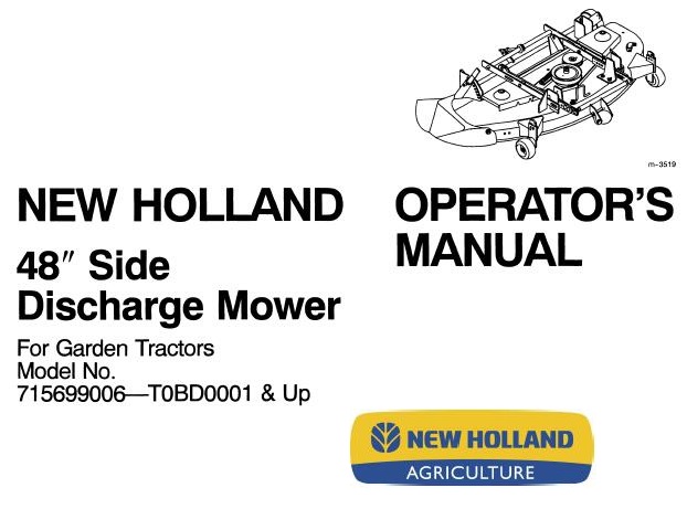 Read This New Holland 48 Side Discharge Mower Operator’s Manual carefully to learn how to operate and service your machine correctly. Failure to do so could result in personal injury or equipment damage.
