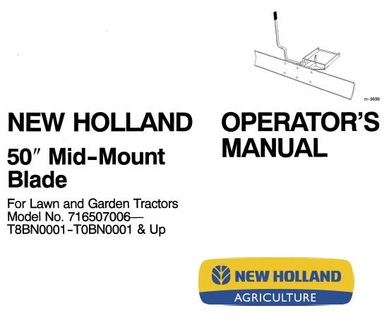 Read This New Holland 50 Mid-MOUNT Blade For Lawn and Genden Tractor Operator’s Manual carefully to learn how to operate and service your machine correctly. Failure to do so could result in personal injury or equipment damage.