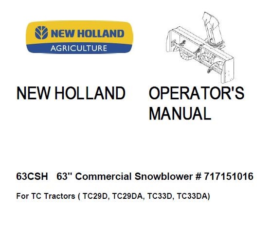 Read This New Holland 63CSH 63″ Commercial Snowblower Operator’s Manual carefully to learn how to operate and service your machine correctly. Failure to do so could result in personal injury or equipment damage.