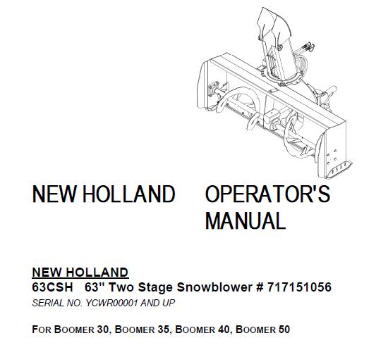 Read This New Holland 63CSH 63″ Two Stage Snowblower ( FOR BOOMER 30, BOOMER 35, BOOMER 40, BOOMER 50 ) Operator’s Manual carefully to learn how to operate and service your machine correctly. Failure to do so could result in personal injury or equipment damage.