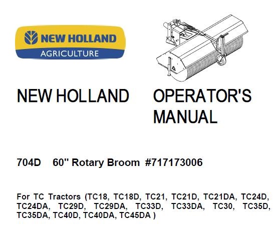 Read This New Holland 704D 60″ Rotary Broom Operator’s Manual carefully to learn how to operate and service your machine correctly. Failure to do so could result in personal injury or equipment damage.