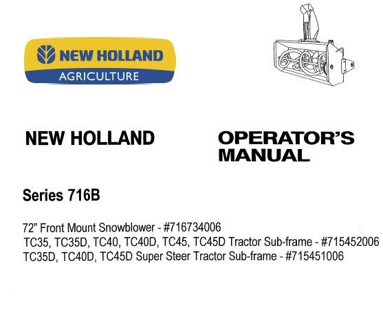 Read This New Holland 72″ Front Mount Snowblower Operator’s Manual carefully to learn how to operate and service your machine correctly. Failure to do so could result in personal injury or equipment damage.
