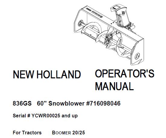 Read This New Holland 836GS 60″ Snowblower Operator’s Manual carefully to learn how to operate and service your machine correctly. Failure to do so could result in personal injury or equipment damage.