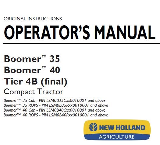 Read This New Holland Boomer 35, Boomer 40 Tier 4B (final) Compact Tractor Operator’s Manual carefully to learn how to operate and service your machine correctly. Failure to do so could result in personal injury or equipment damage.