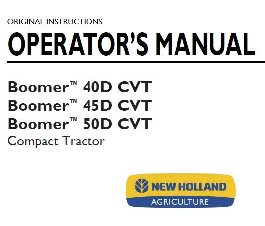 Read This New Holland Boomer 40D CVT, Boomer 45D CVT, Boomer 50D CVT Compact Tractor Operator’s Manual carefully to learn how to operate and service your machine correctly. Failure to do so could result in personal injury or equipment damage.