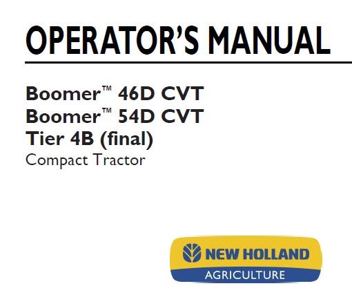 Read This New Holland Boomer 46D CVT, Boomer 54D CVT Tier 4B (final) Compact Tractor Operator’s Manual carefully to learn how to operate and service your machine correctly. Failure to do so could result in personal injury or equipment damage.