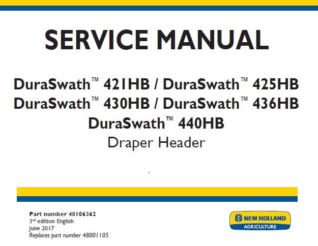 Use this New Holland Dura Swath 421HB, 425HB, 430HB, 436HB, 440HB Draper Header service repair manual, Any owner could make the right decisions about how to maintain and repair their machine. We not only provide quality manuals, but we will also Provide excellent after-sales service, Customer Satisfaction Guaranteed!