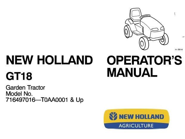 Read This New Holland GT18 Garden Tractor Operator’s Manual carefully to learn how to operate and service your machine correctly. Failure to do so could result in personal injury or equipment damage.