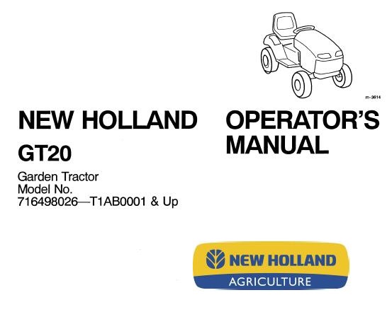 Read This New Holland GT20 Garden Tractor Operator’s Manual carefully to learn how to operate and service your machine correctly. Failure to do so could result in personal injury or equipment damage.