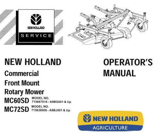 Read This New Holland MC60SD, MC72SD Commercial Front Mount Rotary Mower Operator’s Manual carefully to learn how to operate and service your machine correctly. Failure to do so could result in personal injury or equipment damage.