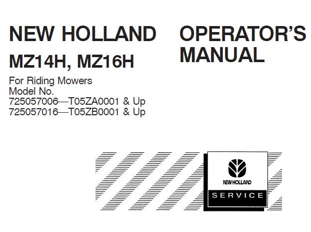 Read This New Holland MZ14H, MZ16H For Riding Mowers Operator’s Manual carefully to learn how to operate and service your machine correctly. Failure to do so could result in personal injury or equipment damage.