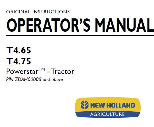 Read This New Holland T4.65, T4.75 Powerstar Tractor Operator’s Manual carefully to learn how to operate and service your machine correctly. Failure to do so could result in personal injury or equipment damage.