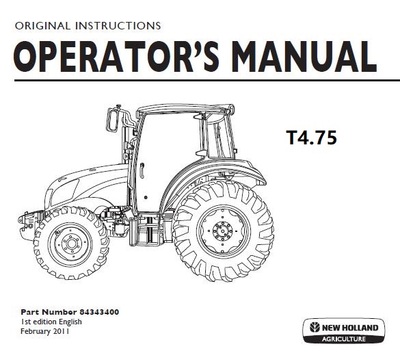 Read This New Holland T4.75 Tractor Operator’s Manual carefully to learn how to operate and service your machine correctly. Failure to do so could result in personal injury or equipment damage.