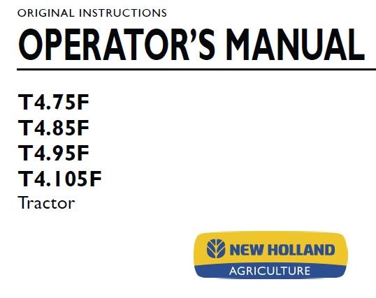 Read This New Holland T4.75F , T4.85F , T4.95F , T4.105F Tractor Operator’s Manual carefully to learn how to operate and service your machine correctly. Failure to do so could result in personal injury or equipment damage.