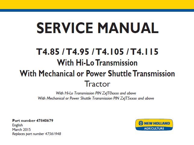 When your New Holland T4.85, T4.95, T4.105, T4.115 (With Hi-Lo Transmission , With Mechanical or Power Shuttle Transmission) Tractors needs maintenance or repair,This service repair manual is great to have.