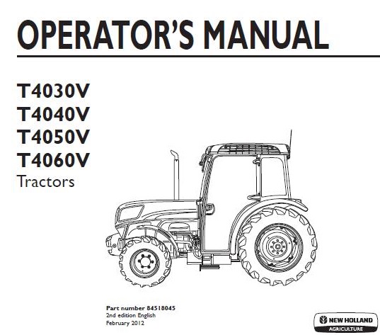 Read This New Holland T4030V, T4040V, T4050V, T4060V Tractor Operator’s Manual carefully to learn how to operate and service your machine correctly. Failure to do so could result in personal injury or equipment damage.