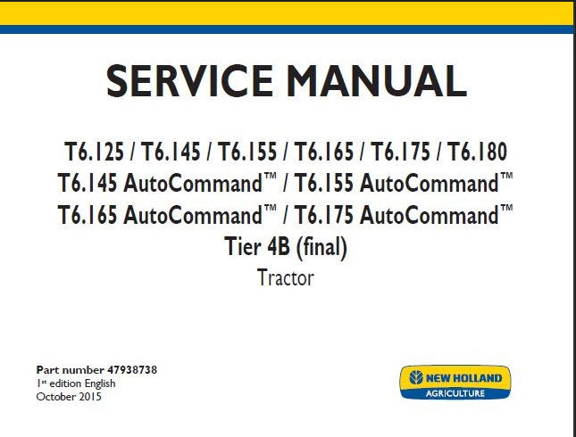 When your New Holland T6.125 / T6.145 / T6.155 / T6.165 / T6.175 / T6.180 / T6.145 AutoCommand / T6.155 AutoCommand / T6.165 AutoCommand / T6.175 AutoCommand Tier 4B (final) Tractor needs maintenance or repair,This service repair manual is great to have.