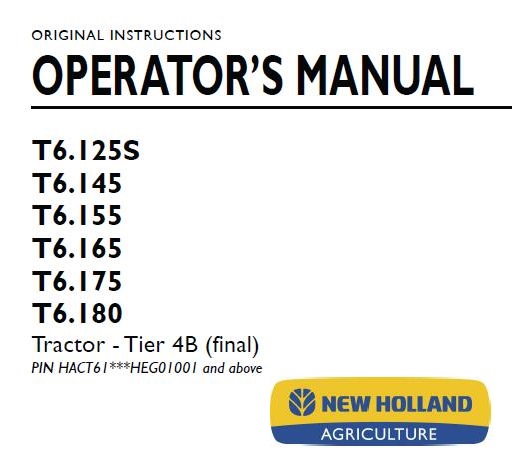 Read This New Holland T6.125S, T6.145, T6.155, T6.165, T6.175, T6.180 Tier 4B (final) Tractor Operator’s Manual carefully to learn how to operate and service your machine correctly. Failure to do so could result in personal injury or equipment damage.