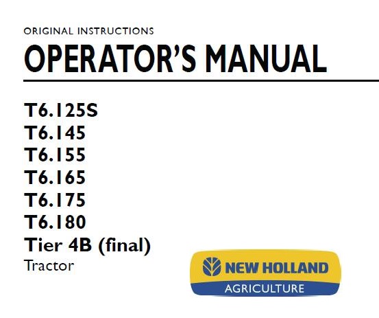 Read This New Holland T6.125S, T6.145, T6.155, T6.165, T6.175, T6.180 Tier 4B (final) Tractor Operator’s Manual carefully to learn how to operate and service your machine correctly. Failure to do so could result in personal injury or equipment damage.