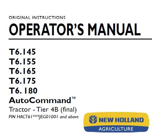 Read This New Holland T6.145, T6.155, T6.165, T6.175, T6. 180 AutoCommand Tier 4B (final) Tractor Operator’s Manual carefully to learn how to operate and service your machine correctly. Failure to do so could result in personal injury or equipment damage.