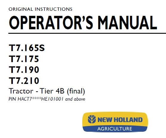 Read This New Holland T7.165S, T7.175, T7.190, T7.210 Tier 4B (final) Tractor Operator’s Manual carefully to learn how to operate and service your machine correctly. Failure to do so could result in personal injury or equipment damage.