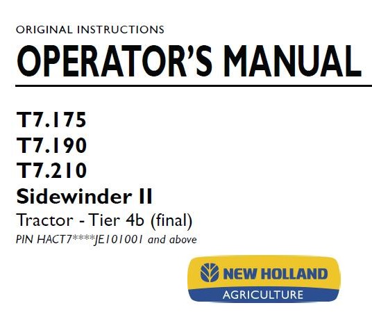 Read This New Holland T7.175, T7.190, T7.210 Sidewinder II Tier 4b (final) Tractor Operator’s Manual carefully to learn how to operate and service your machine correctly. Failure to do so could result in personal injury or equipment damage.