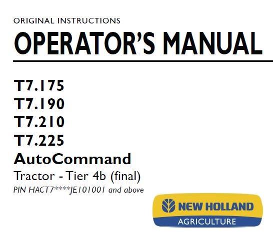Read This New Holland T7.175, T7.190, T7.210, T7.225 Tier 4b (final) AutoCommand Tractor Operator’s Manual carefully to learn how to operate and service your machine correctly. Failure to do so could result in personal injury or equipment damage.