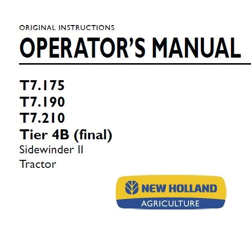 Read This New Holland T7.175, T7.190, T7.210, Tier 4B (final) Sidewinder II Tractor Operator’s Manual carefully to learn how to operate and service your machine correctly. Failure to do so could result in personal injury or equipment damage.