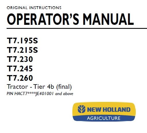 Read This New Holland T7.195S, T7.215S, T7.230, T7.245, T7.260 Tier 4b (final) Tractor Operator’s Manual carefully to learn how to operate and service your machine correctly. Failure to do so could result in personal injury or equipment damage.