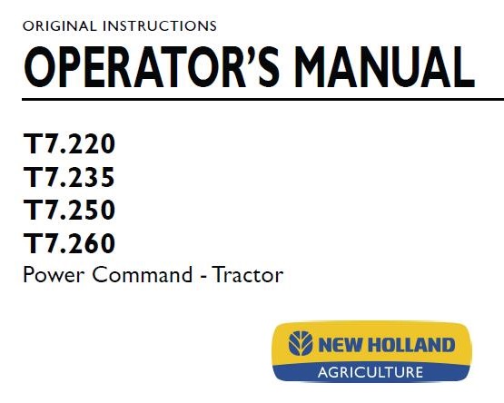 Read This New Holland T7.220, T7.235, T7.250, T7.260 Power Command Tractor Operator’s Manual carefully to learn how to operate and service your machine correctly. Failure to do so could result in personal injury or equipment damage.
