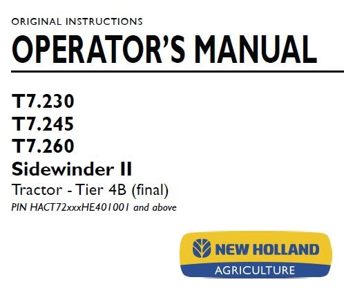 Read This New Holland T7.230, T7.245, T7.260 Sidewinder II Tier 4B (final) Tractor Operator’s Manual carefully to learn how to operate and service your machine correctly. Failure to do so could result in personal injury or equipment damage.