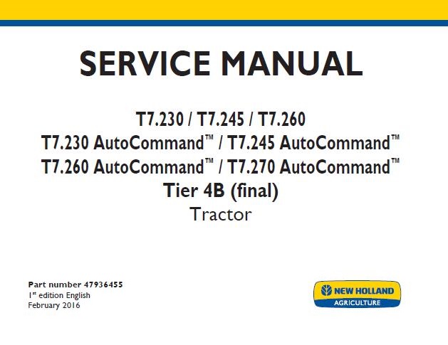 When your New Holland T7.230 / T7.245 / T7.260 / T7.230 AutoCommand / T7.245 AutoCommand / T7.260 AutoCommand / T7.270 AutoCommand Tier 4B (final) Tractor needs maintenance or repair,This service repair manual is great to have.