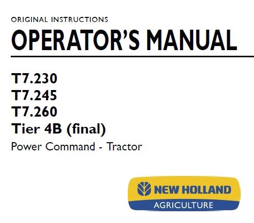 Read This New Holland T7.230, T7.245, T7.260, Tier 4B (final) Power Command Tractor Operator’s Manual carefully to learn how to operate and service your machine correctly. Failure to do so could result in personal injury or equipment damage.