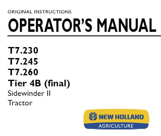 Read This New Holland T7.230, T7.245, T7.260 Tier 4B (final) Sidewinder II Tractor Operator’s Manual carefully to learn how to operate and service your machine correctly. Failure to do so could result in personal injury or equipment damage.