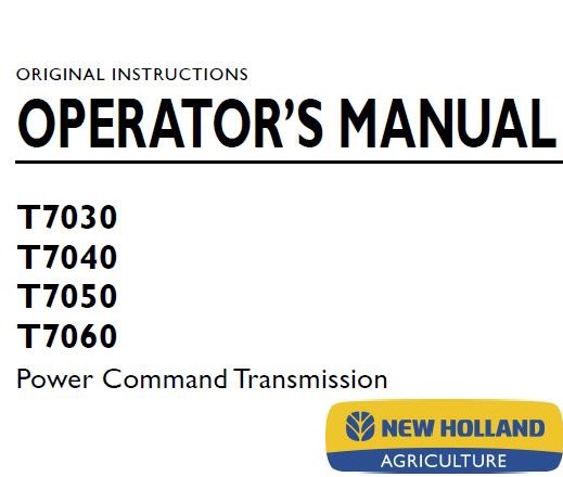 Read This New Holland T7030, T7040, T7050, T7060 Power Command Transmission Tractor Operator’s Manual carefully to learn how to operate and service your machine correctly. Failure to do so could result in personal injury or equipment damage.