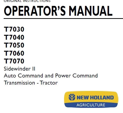 Read This New Holland T7030, T7040, T7050, T7060, T7070 Sidewinder II Auto Command and Power Command Transmission Power Command Tractor Operator’s Manual carefully to learn how to operate and service your machine correctly. Failure to do so could result in personal injury or equipment damage.