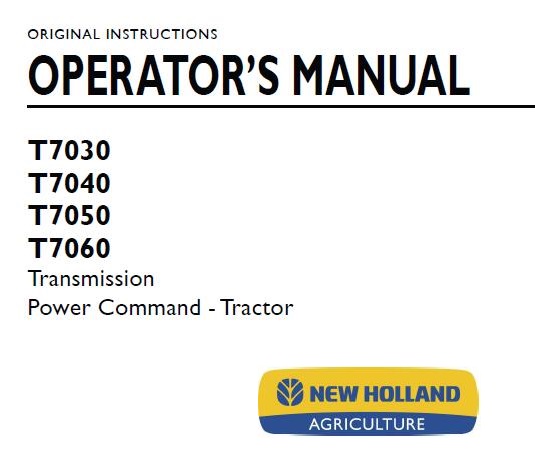 Read This New Holland T7030, T7040, T7050, T7060 Transmission Power Command Tractor Operator’s Manual carefully to learn how to operate and service your machine correctly. Failure to do so could result in personal injury or equipment damage.