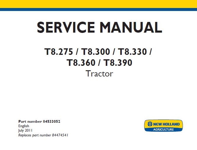 When your New Holland T8.275 / T8.300 / T8.330 / T8.360 / T8.390 Tractor needs maintenance or repair,This service repair manual is great to have.