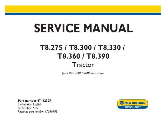 When your New Holland T8.275, T8.300, T8.330, T8.360, T8.390 Tractor needs maintenance or repair,This service repair manual is great to have.