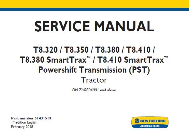 When your New Holland T8.320 / T8.350 / T8.380 / T8.410 / T8.380 SmartTrax / T8.410 SmartTrax Powershift Transmission (PST) Tractors needs maintenance or repair,This service repair manual is great to have.