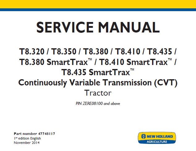 When your New Holland T8.320 / T8.350 / T8.380 / T8.410 / T8.435 / T8.380 SmartTrax / T8.410 SmartTrax / T8.435 SmartTrax Continuously Variable Transmission (CVT) TIER 4B Tractors needs maintenance or repair,This service repair manual is great to have.