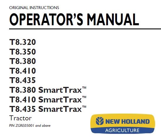 Read This New Holland T8.320, T8.350, T8.380, T8.410, T8.435, T8.380 SmartTrax, T8.410 SmartTrax, T8.435 SmartTrax Tractor Operator’s Manual carefully to learn how to operate and service your machine correctly. Failure to do so could result in personal injury or equipment damage.