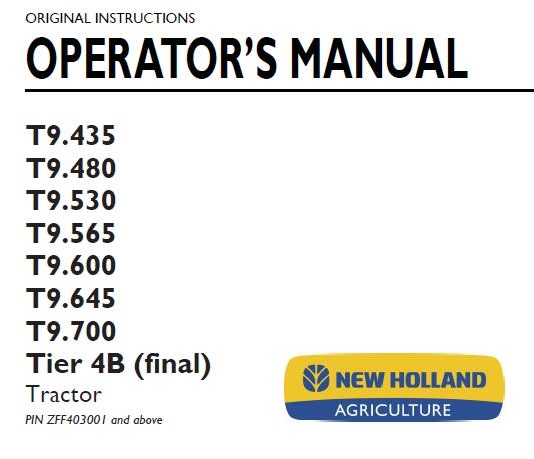 Read This New Holland T9.435, T9.480, T9.530, T9.565, T9.600, T9.645, T9.700 Tier 4B (final) Tractor Operator’s Manual carefully to learn how to operate and service your machine correctly. Failure to do so could result in personal injury or equipment damage.