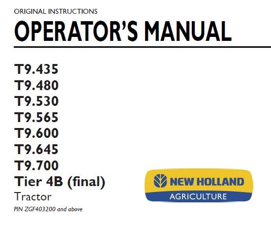 Read This New Holland T9.435, T9.480, T9.530, T9.565, T9.600, T9.645, T9.700 Tier 4B (final) Tractor Operator’s Manual carefully to learn how to operate and service your machine correctly. Failure to do so could result in personal injury or equipment damage.