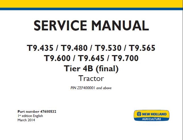 When your New Holland T9.435 / T9.480 / T9.530 / T9.565 / T9.600 / T9.645 / T9.700 Tier 4B (final) Tractors needs maintenance or repair,This service repair manual is great to have.