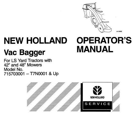Read This New Holland Vac Bagger For LS Yard Tractors with 42″ and 48″ Mowers Operator’s Manual carefully to learn how to operate and service your machine correctly. Failure to do so could result in personal injury or equipment damage.