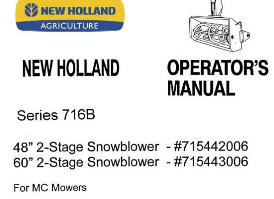Read This New Holland 48", 60" 2-Stage Snowblower For MC Mower Operator's Manual carefully to learn how to operate and service your machine correctly. Failure to do so could…